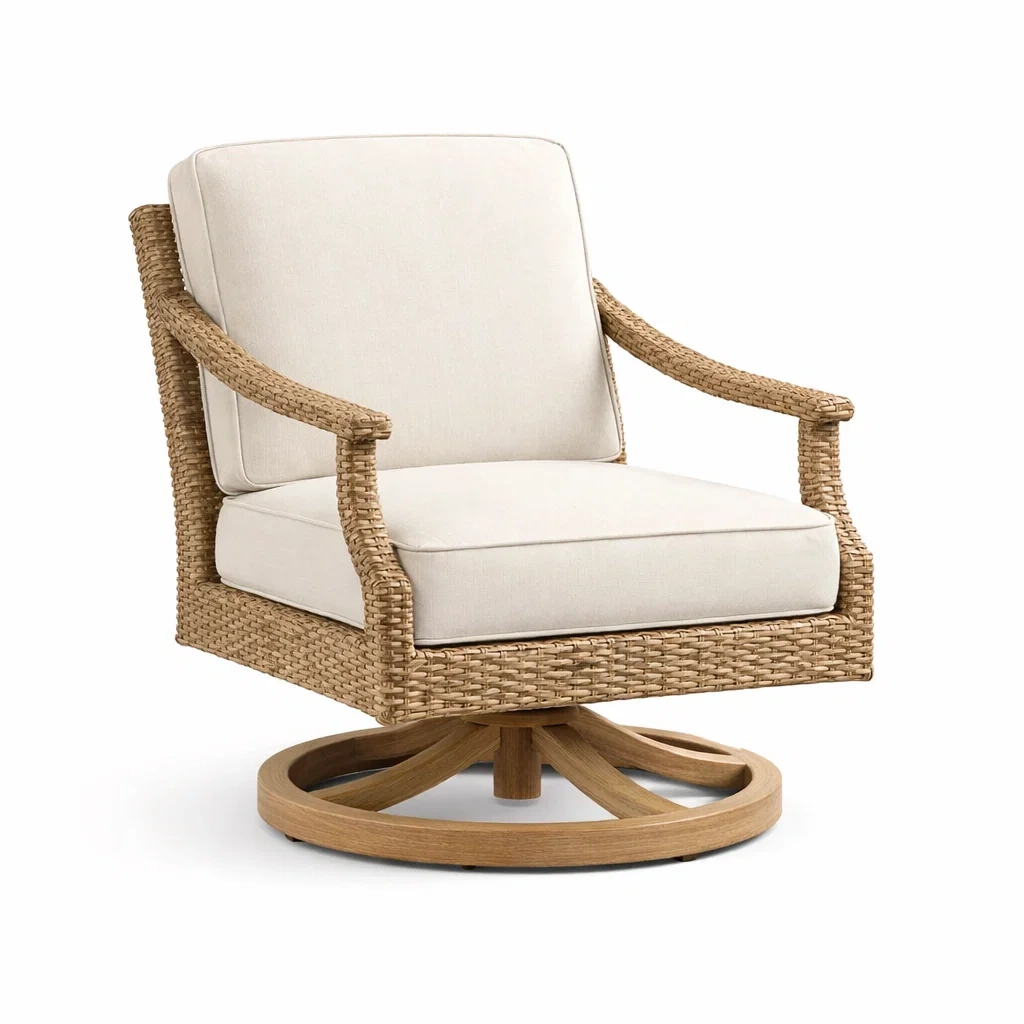 Fauteuil pivotant avec structure en rotin tissé et base en bois massif. Coussins amovibles en tissu polyester de couleur crème. Dimensions : largeur 75 cm, profondeur 85 cm, hauteur 95 cm. Poids maximum supporté : 120 kg.