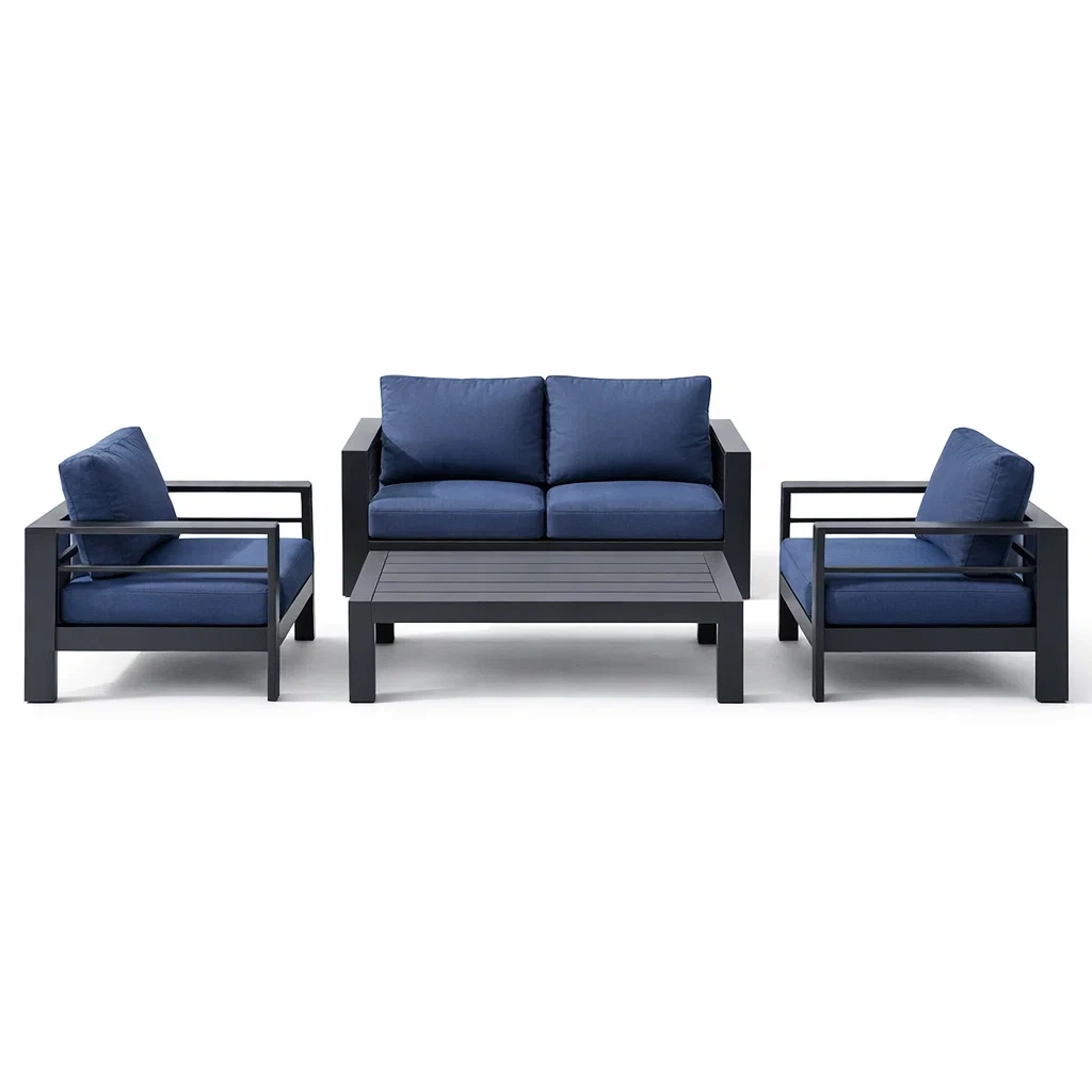 Dimensions : Canapé 2 places - 140 cm x 80 cm x 70 cm ; Fauteuils - 80 cm x 80 cm x 70 cm ; Table - 100 cm x 60 cm x 40 cm