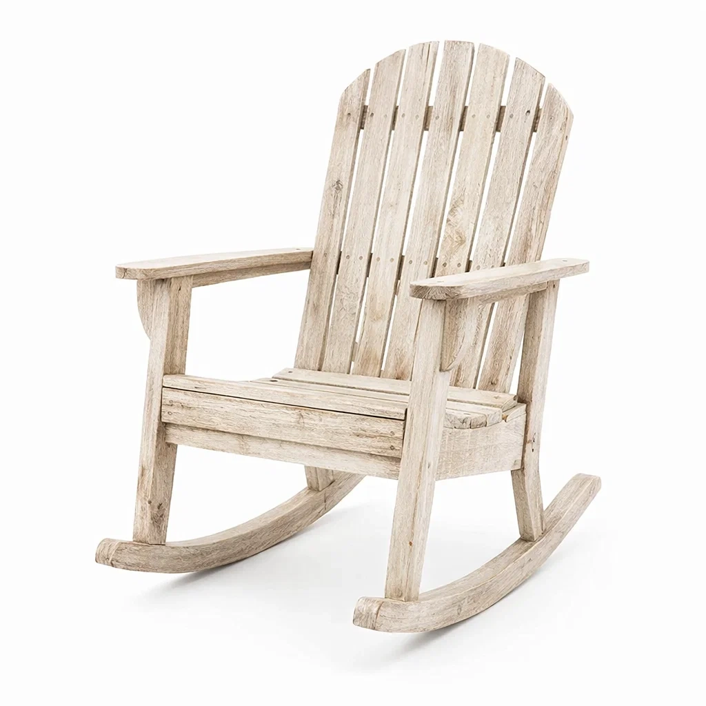 Chaise berçante en bois d'acacia avec surface patinée non traitée.